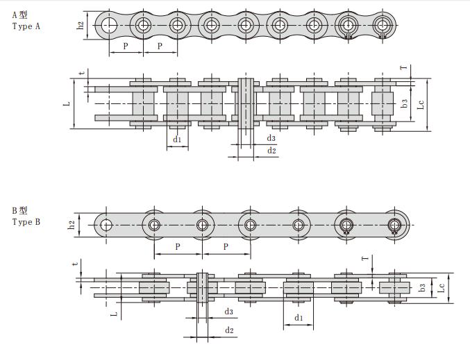 鏈號(hào) 節(jié)距 滾子直徑 外節(jié)內(nèi)寬 銷(xiāo)軸直徑 銷(xiāo)軸長(zhǎng)度 內(nèi)鏈板高度 鏈板厚度 破斷載荷 每米長(zhǎng)重 型號(hào)