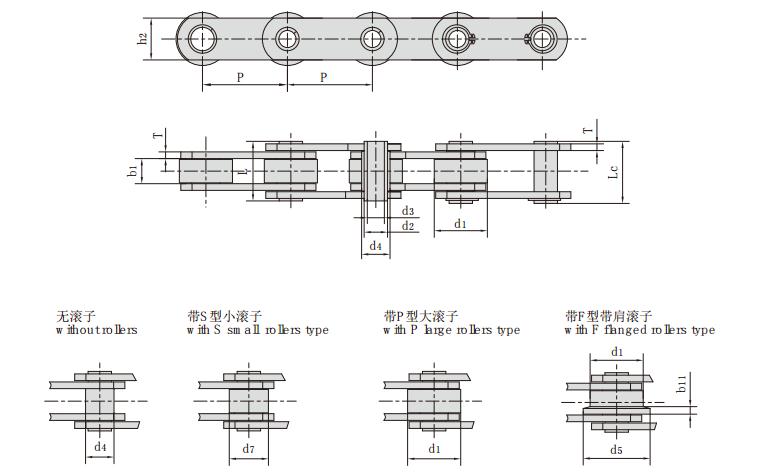 鏈號(hào) 節(jié)距 滾子尺寸 套筒直徑 鏈板高度 內(nèi)節(jié)內(nèi)寬 銷(xiāo)軸直徑 銷(xiāo)軸長(zhǎng)度 鏈板厚度 抗拉強(qiáng)度