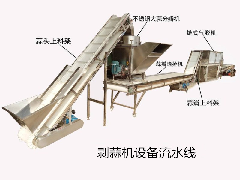 用機器代替手工剝蒜皮的機械,整個剝蒜機設(shè)備流水線分為:蒜頭上料架,不銹鋼大蒜分瓣機,蒜瓣選撿機,蒜瓣上料架以及