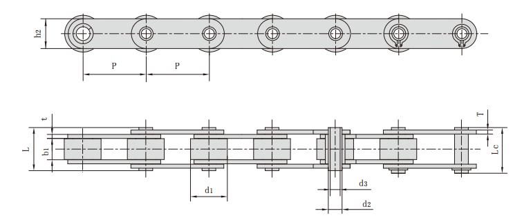 餅干輸送線,糕點輸送線,食品機械輸送線,主要選用不銹鋼雙節(jié)距空心銷軸鏈為主,圖中選用型號為C2042HPSS,中間連接桿總長度為640mm,連接桿直徑8mm,鏈條主要規(guī)格參數(shù)見下圖: