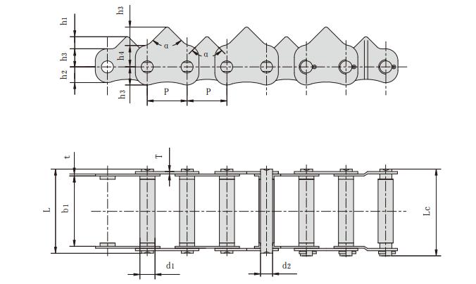 鏈號 節距 滾子直徑 內節內寬 銷軸直徑 銷軸長度 齒形角 鏈板厚度 鏈板尺寸 抗拉強度 平均抗拉強度