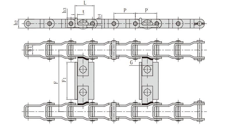 鏈號 節(jié)距 內(nèi)節(jié)內(nèi)寬 鏈板高度 附板尺寸 抗拉強(qiáng)度
