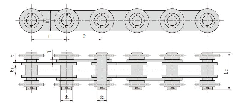 鏈號 節距 滾子直徑 內節內寬 銷軸直徑 銷軸長度 內鏈板高度 鏈板厚度 抗拉強度 每米長重