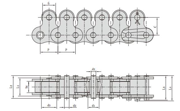 鏈號 節(jié)距 滾子直徑 內(nèi)節(jié)內(nèi)寬 銷軸直徑 銷軸長度 附板尺寸 抗拉強(qiáng)度 每米長重