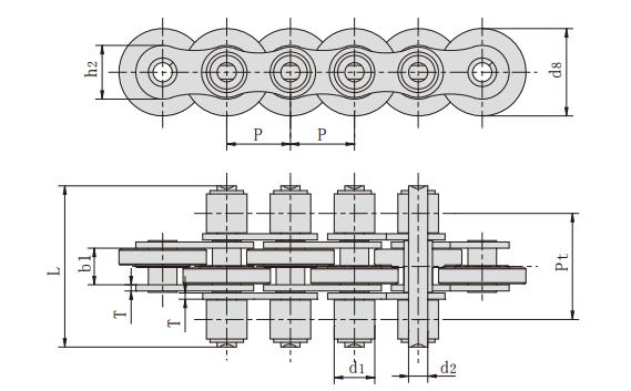 鏈號 節距 滾子直徑 內節內寬 銷軸直徑 銷軸長度 鏈板尺寸 排距 抗拉強度 平均抗拉強度